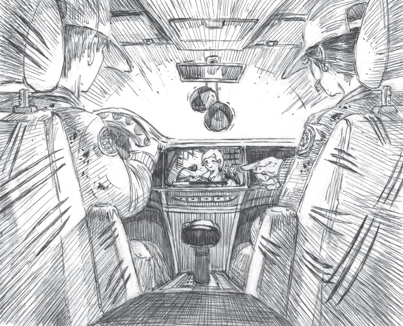 Chuckling, the three cats climb into the van. The door slides shut. The van’s tires spew up