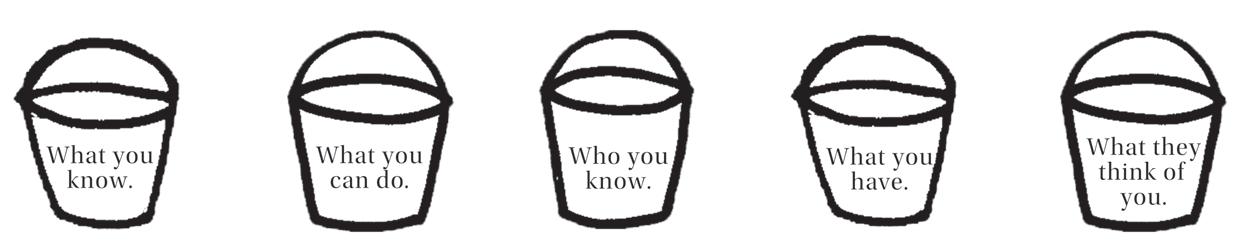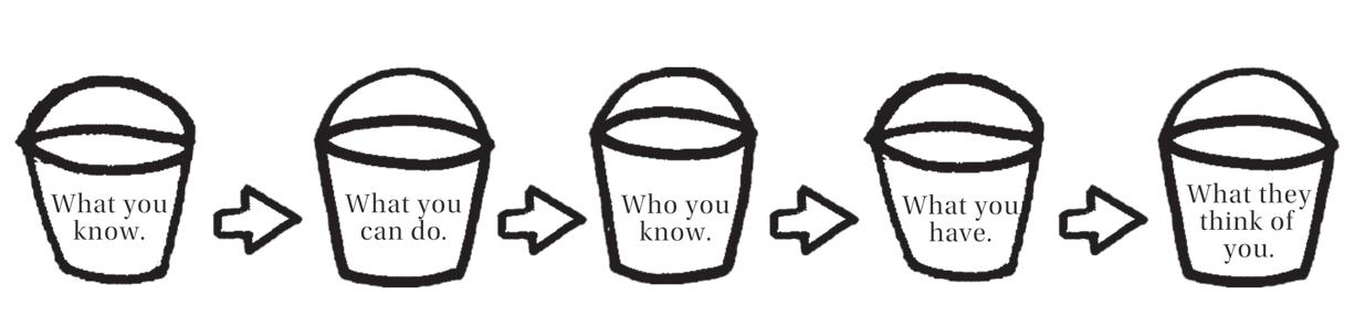 Applied knowledge is skill, and the more you can expand and apply your knowledge, the more value you’ll create in the world. This value will be repaid in a growing network, abundant resources and a robust reputation. Make sure you fi ll your buckets in the right order.