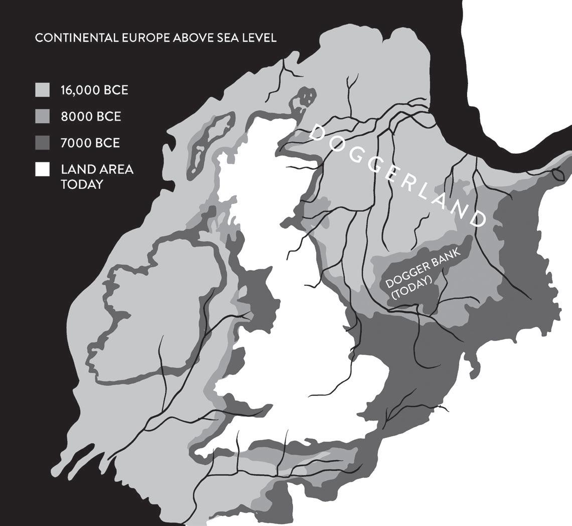 It was around 15,000 years ago that the temperature began to rise year on year, gradually releasing Britain from its glacial mantle. Although Britain had been an island separated from Europe in earlier warm periods, at this time, as the land began to blush with returning vegetation, the outline of Britain was unrecognisable, consumed within the vast northwest corner of Europe; land that extended from northern Brittany around the west of Ireland, encompassing the Outer Hebrides and Shetland islands to northern Denmark. Where the North Sea is today was a great expanse of rolling hills, valleys, rivers and marshland that we call Doggerland.