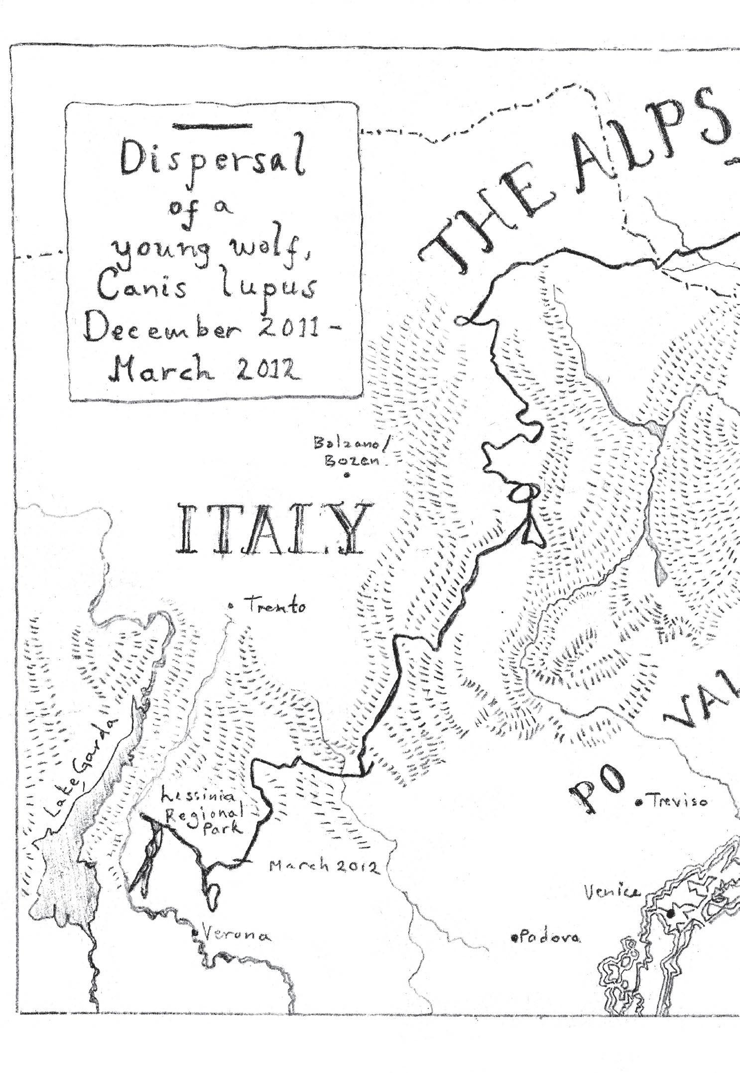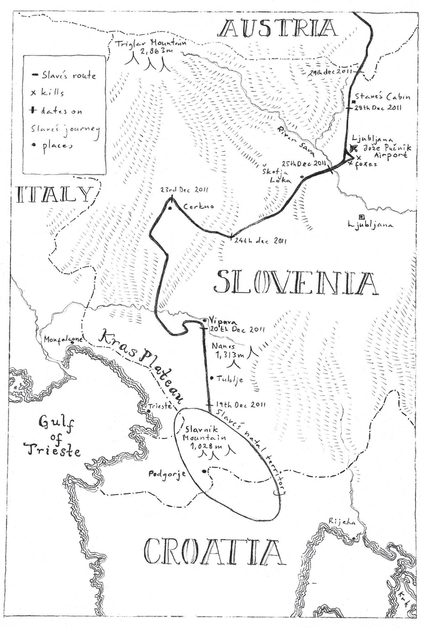 their gears on the inclines, their air brakes gasping. Since he was young he has learnt how to navigate this road; to find its culverts and the rips in its chain-link fence. Along with how to hunt and his place within the pack, these are things that young wolves here must know. They are the things that their survival is predicated on. Everything about this land is utterly familiar. The smells, the sounds, nothing out of place. He learns through difference. In essence, the wolf is a conservative species. He retains a sharp memory of the trap, last summer, his forefoot clamped and the utter terror, and of later waking, woozy, and the awful, human scent all over him, and the thing awkward around his neck. Sometimes he is still aware of the collar that he wears. He will not make such a mistake again. His brother was shot. He saw it happen. One-third of them, at least, die before their first year is out. Already he is a wolf that defies odds. He is conservative, but he is driven, too, by an irrefutable force. A force to eat, a force to breed, a force to live. This, too, his survival is predicated on. And it will be on this same night, 19 December 2011, just after three-thirty in the morning, when for the first time in his life he will set foot outside the boundary of his territory. He will take a bearing north-north-east, following a logging road along the Bukovica ridge, sloping away from Slavnik’s summit. Eighty kilometres away, in a room on the second floor of the Biotechnical Faculty in the University of Ljubljana, a GPS point will appear on a computer screen.