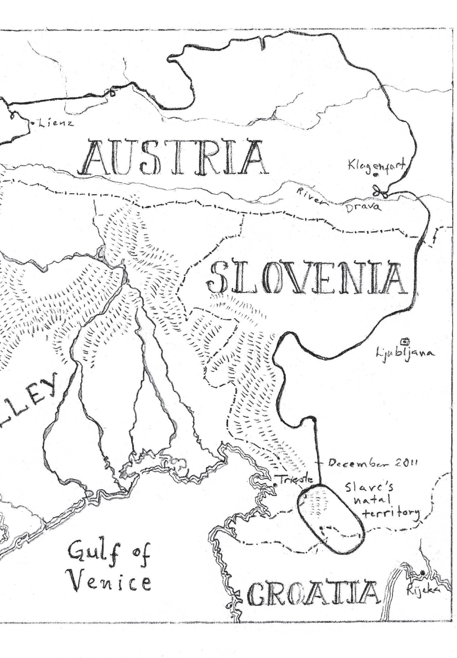 But it is the dark-brown thread that draws the eye. Beginning on the Ćićarija plateau in the south-west of the country, not far off the coast, it arcs across the western ranges of the Alps before descending to Ljubljana’s plain, just north of the capital, a few kilometres off from where we stand. From there it turns north, making a beeline for the Austrian border, and vanishes off the top of the map. The last point is pinned where the thread meets the ceiling tiles. The bobbin bears the date 19.12.11. And a name – Slavc.