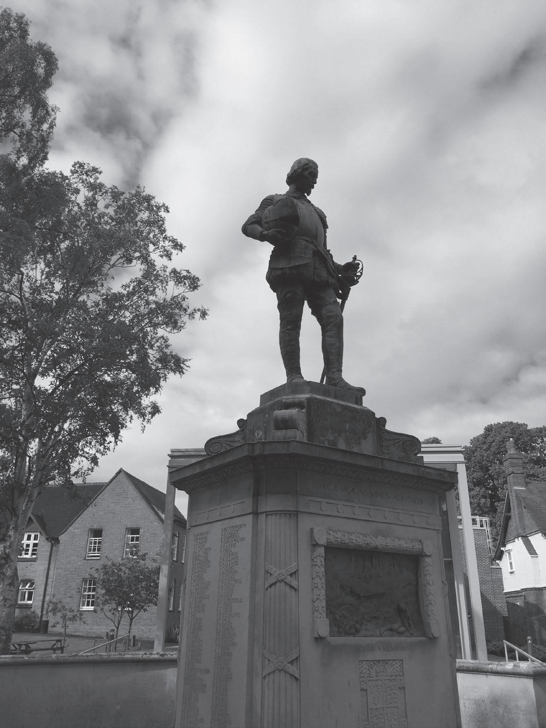 The statue of Sir Philip Sidney atop the Shrewsbury School war memorial.