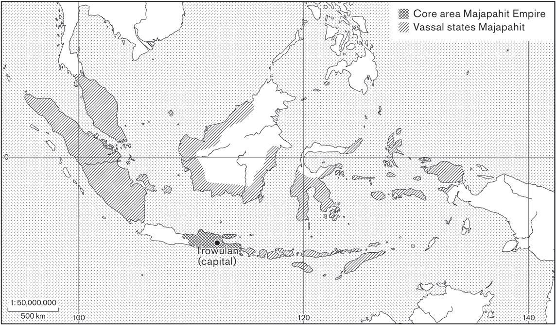 This cultural fusion reached its pinnacle in the fourteenthcentury Majapahit empire, centred in Java, which spanned the archipelago from Malaysia to New Guinea. It was not as unified as the Roman empire; the ruler in the capital worked together with local vassals. But in the twentieth- century struggle for independence, Majapahit was the ultimate historical prototype, the proof that there had once been a great and glorious homegrown empire. Majapahit was the source of the red and white used in the revolutionary fl ag and retained as today’s national colours. Architecture, wood carving, batik, dance and the Javanese language reached an unprecedented level of refi nement. In the Majapahit courts, ancient Indian epic poems such as the Mahabharata and the Ramayana took on their characteristic Javanese form: a wondrous wayang play with