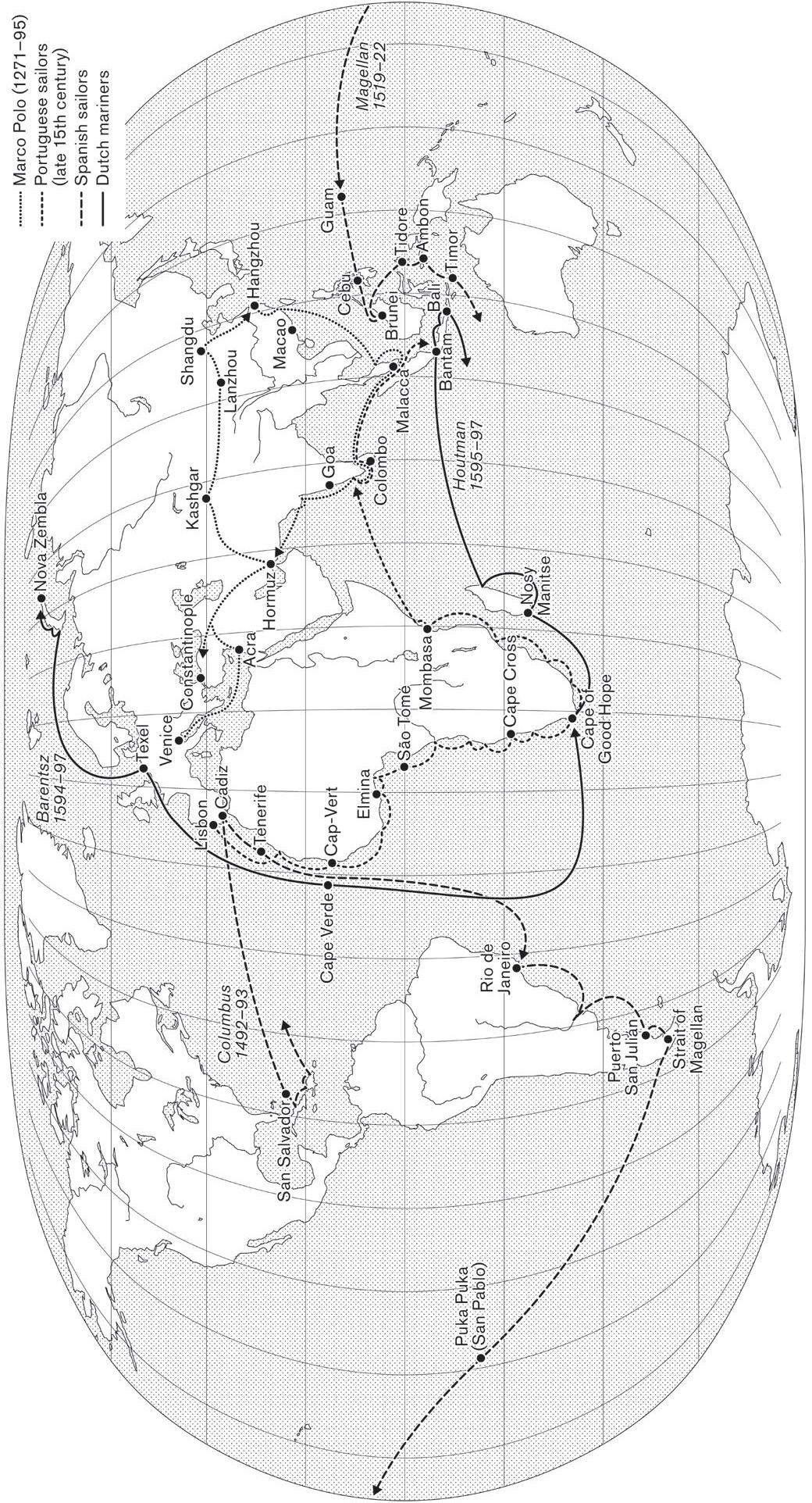 Italian Peninsula. They were the fi rst Christians to handle the nut after all the animists, Buddhists, Hindus, Muslims, Jains and Zoroastrians along the route. And then the little gem had to fi nd its way over land, along the coast and up inland waterways to Bruges. And of course, every time it changed hands, the price increased, and each port had its own duties and transshipment costs. The consequences are easy to guess. Around , once a handful of cloves had reached Venice, it might easily cost a hundred times as much as it had in the Moluccas (or ‘Spice Islands’). Wasn’t there a cheaper way?