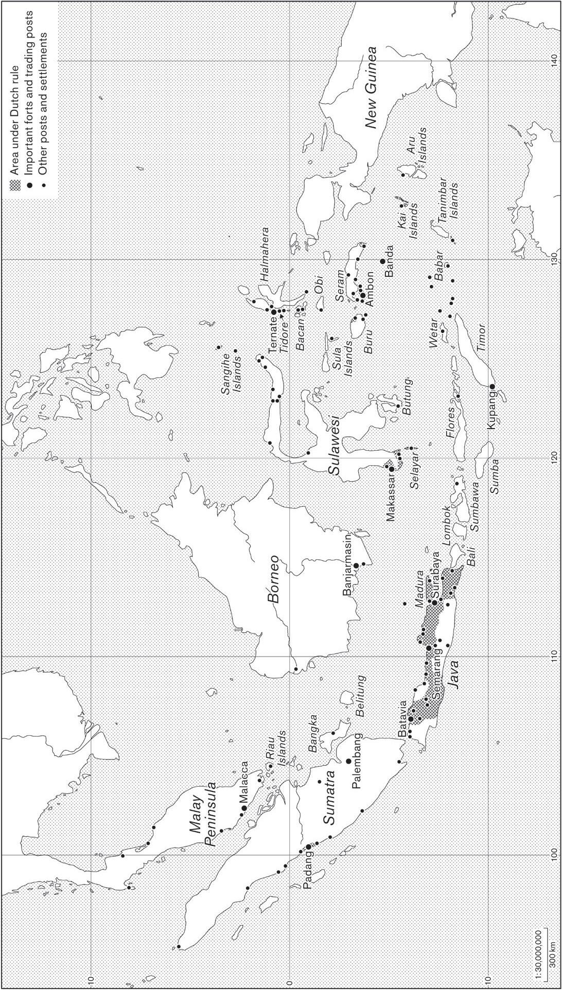 The fi rst stage in assembling the jigsaw lasted from about to . For the VOC’s fi rst century, its motto was, ‘The less land, the better.’ Stations in the East were an expensive proposition, to be contemplated only when absolutely essential for trade. After the conquest of Fort Ambon in , the Netherlands established settlements on Ternate and Banda Neira, two other Moluccan Islands, in . These were obvious choices for commercial reasons; Ternate and nearby Tidore were the islands from which the trade in cloves was controlled, and Banda, a mini-archipelago kilometres further south, was the only place where nutmeg grew. Cloves are the dried flower buds of the clove tree; when fresh, they are bright green, soft and fleshy. Nutmeg is the seed of a green fruit. The name comes from nuces moschatae, ‘nuts that smell of musk’.