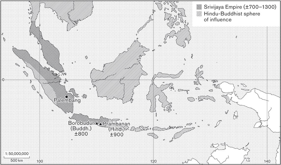 The city now called Palembang in South Sumatra was the capital of a powerful Buddhist kingdom, Srivijaya. For six centuries, it controlled trade and maritime routes between China and India. Malay became the lingua franca of the seas. Religions from India also took root in Java, even reaching far inland. Forty kilometres to the northwest of present- day Yogyakarta, Borobudur, the world’s largest Buddhist structure, was built around . Its astonishing terraced