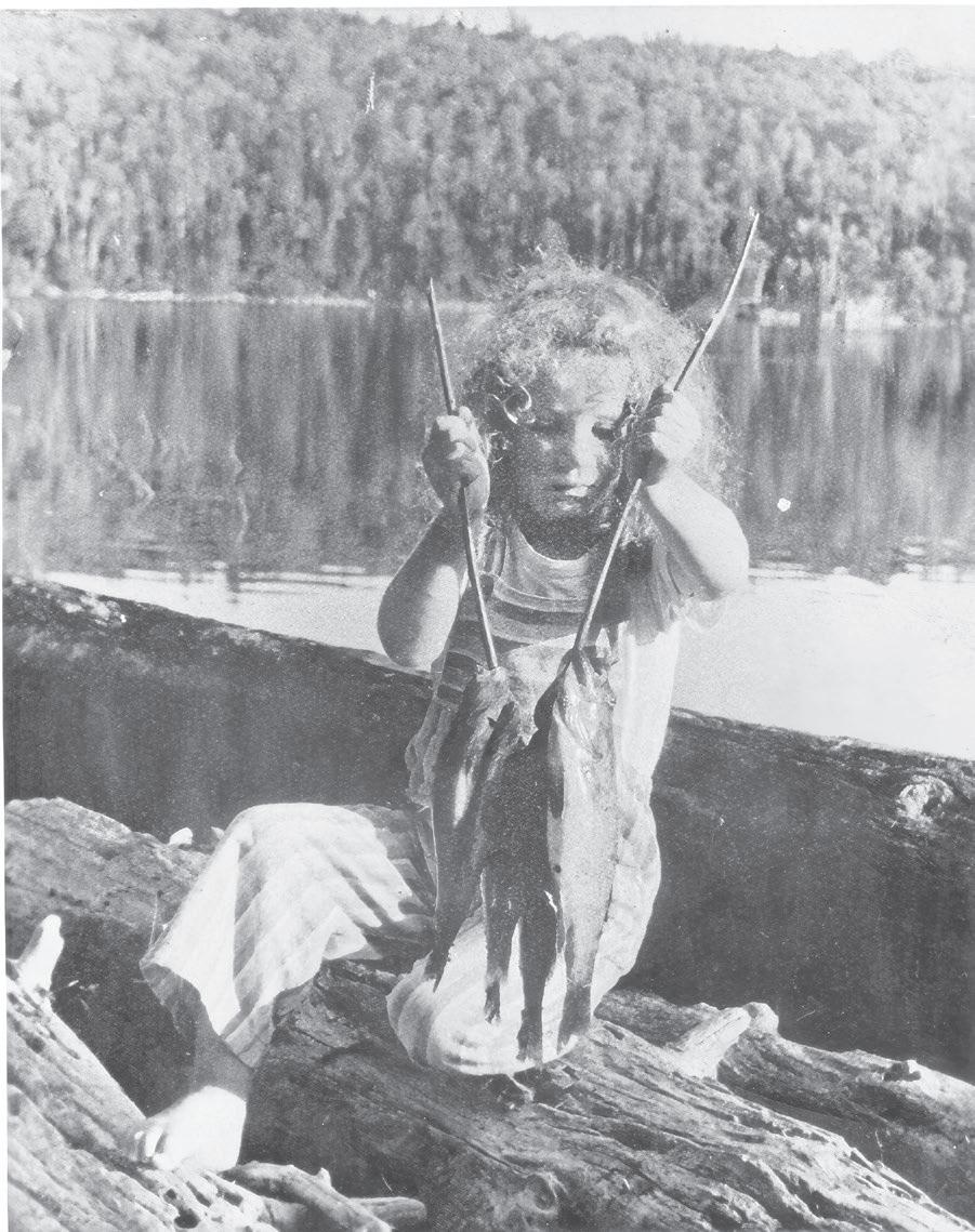 Our father trolled for lake trout in the deeper and colder parts of the lake. Sometimes we’d sh for bass in a group of small lakes known as the Bass Lakes, which also had perch in them. Perch were the rst sh I caught: I’m ve in this photo, holding a stringer of them, with an expression that might imply I felt sorry for them. I did not, but I didn’t like the shy smell.