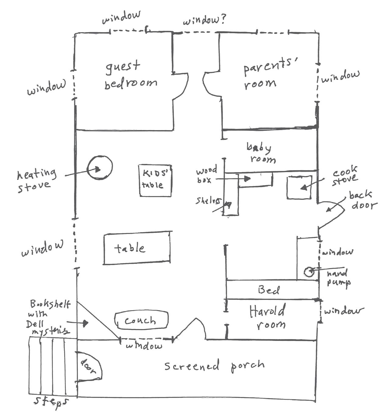 is house disappeared in 1970, having been replaced by a swanky summer home with a road leading to it. But though it has vanished, the house lives on in the Platonic world of forms. I drew this oor plan from memory, and from the clearer memories of my older brother, Harold.