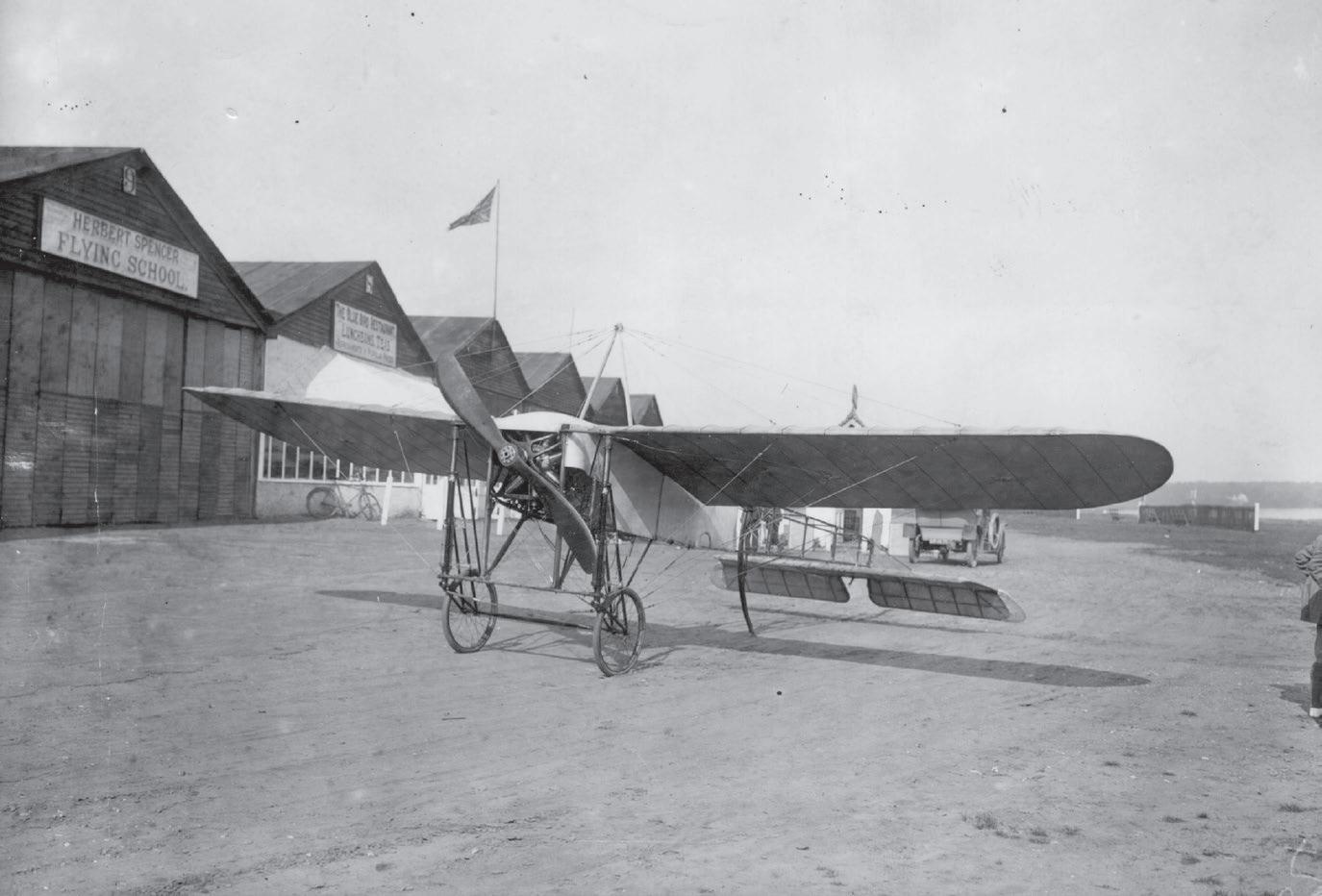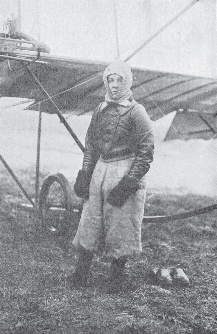 Soon, the amateurs and enthusiasts were joined by business-minded aviators who set up flying schools. The first was founded in 1910 by Hilda Hewlett and Gustav Blondeau. Hewlett had been born, as Hilda Herbert, into a stifl ing middle-class family in south-west London. Her claustrophobic upbringing transformed into a marriage to Maurice Hewlett, a poet and historical novelist. But the partnership had eventually run its course and was falling apart. Searching for escape, Hewlett witnessed her fi rst aeroplane fl ight in 1909, at Blackpool, when she was forty-five. She later remembered, “I was rooted to the spot in thick mud and wonder and did not want to move. I wanted to feel that power under my own hand and understand about why and how.” When she told her family about her newfound ambition to fly, she was met only with scorn. Her husband, the poet, insisted that women were unsuited to aviation because they didn’t have the nerve. It was just, he said, “a passing and silly escapade.” But Hewlett prophesied a different future. “The time will come,” she said, “when every woman who can drive her own car will also pilot her own aeroplane. All women can begin on an equality with men in the study of aeronautics as it is a new science, and it is delicate and exacting work for which they are quite fitted.”