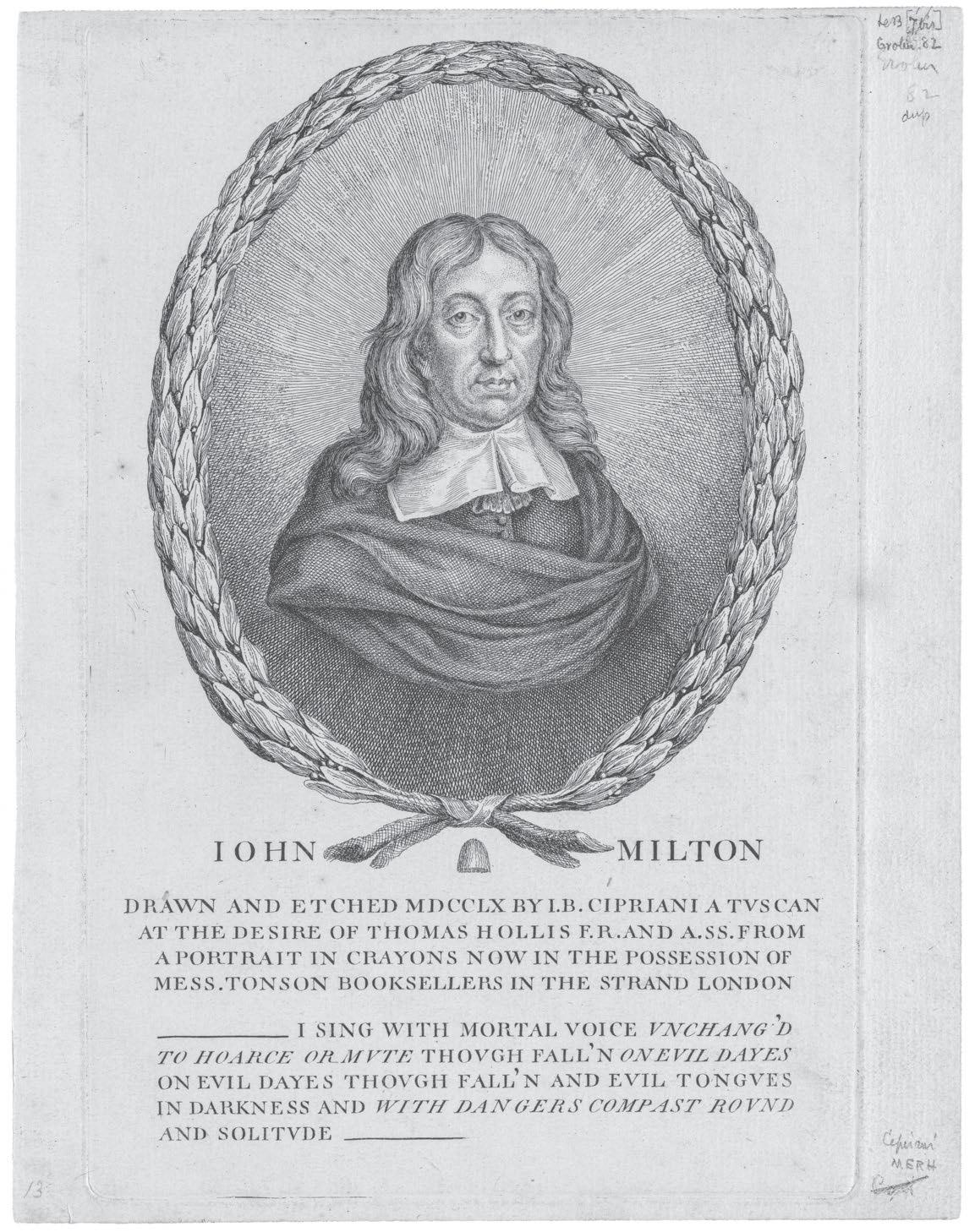 John Milton as a political saint. Engraving by Giovanni Battista Cipriani (1760), made for the radical agitator Thomas Hollis, and based on an image made during the poet’s lifetime.
