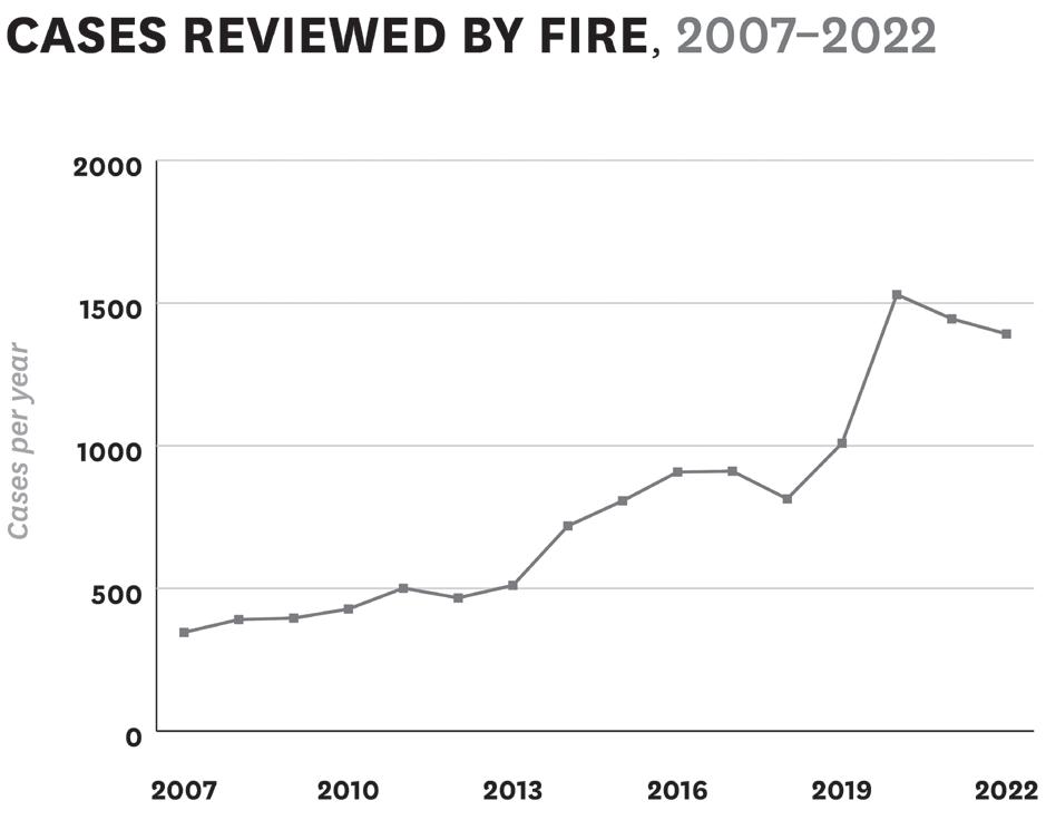 They are right to be concerned—especially considering how campus norms tend to ripple out into the rest of society. It’s hard to overstate just how bad the Cancel Culture situation has gotten on campuses, but let’s start with professors rst. When Greg started at FIRE in 2001, the state of free speech in academia was already poor. But even a single professor getting red for their speech was few and far between. Things got worse, and in 2010 FIRE saw twenty attempts to get professors punished. But then came an explosion. From just 2014 through 2024, we know of more than 1,200 attempts to get professors red, punished, or otherwise silenced. About two thirds of these attempts are successful, resulting in consequences
