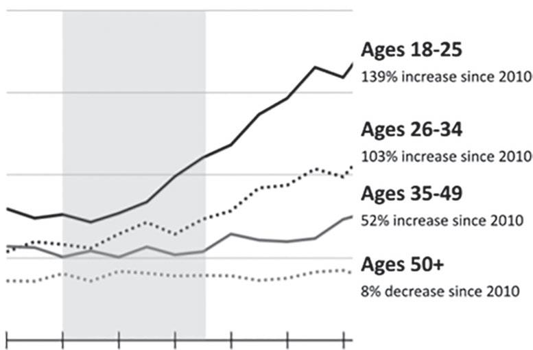 Figure 1.1. Percent of U.S. teens (ages 12–17) who had at least one major depressive episode in the past year, by self-report based on a symptom checklist. is was gure 7.1 in e Coddling of the American Mind, now updated with data beyond 2016. (Source: U.S. National Survey on Drug Use and Health.)3