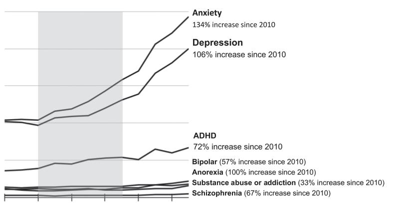 other in both relative and absolute terms. Nearly all of the increases in mental illness on college campuses in the 2010s came from increases in anxiety and/or depression.10