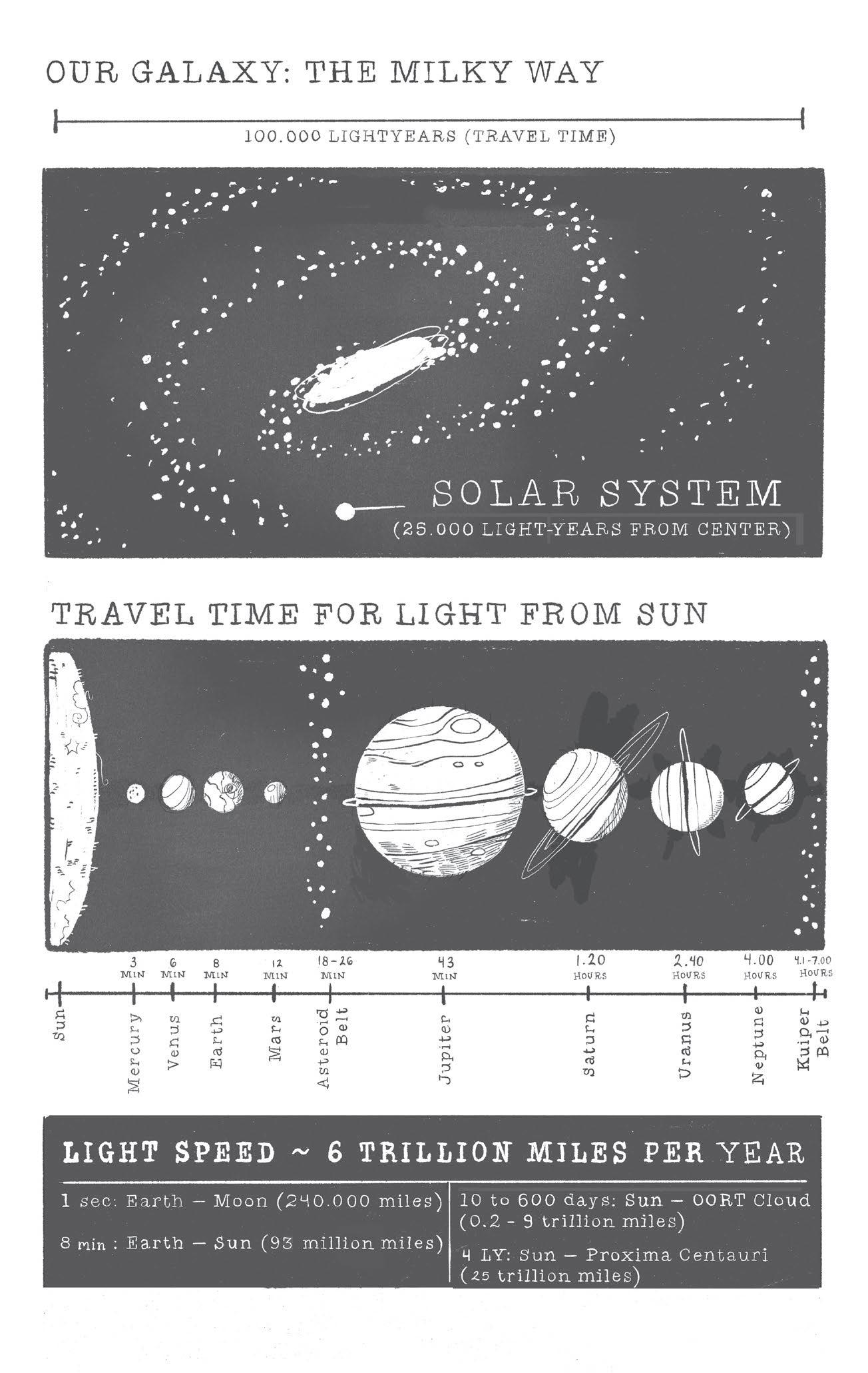 light takes about four years to travel that vast distance. So as well as conveying distance, a light-year scale tells us how long it takes for light to make the trip. We humans are starting to venture into our solar system, but these distances are small compared to the spaces separating the stars.