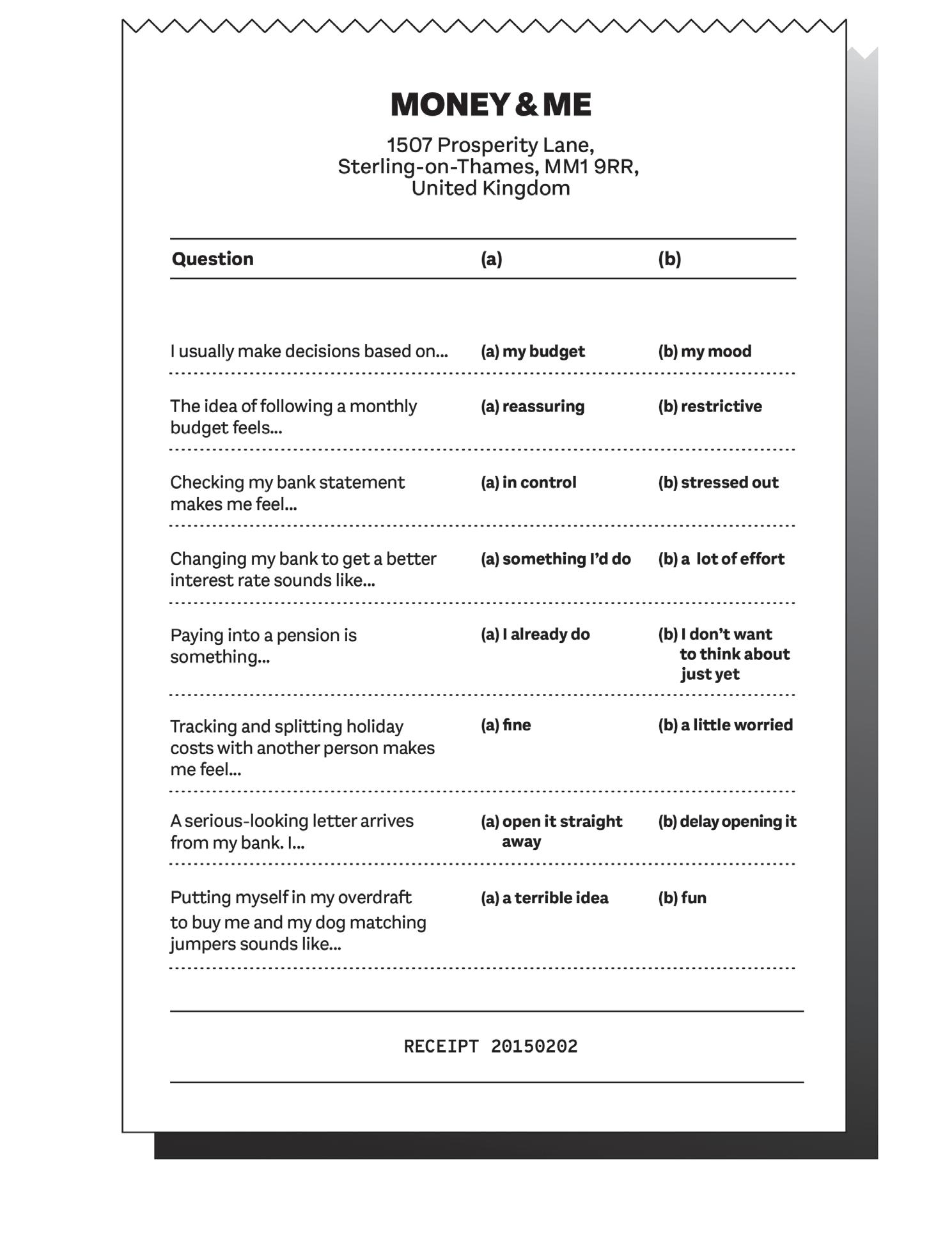 So let’s hold up the money mirror. What’s going on in your brain when it comes to your finances? What’s working? What’s not? What do you want to change? Yep, it’s time for a quiz . . .