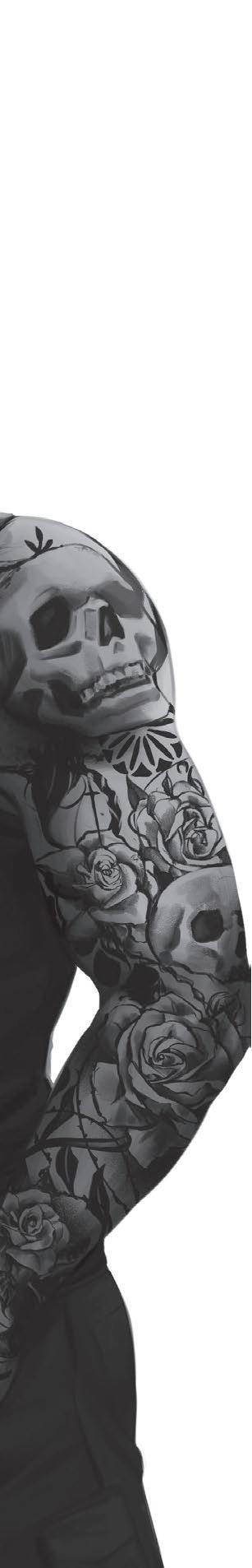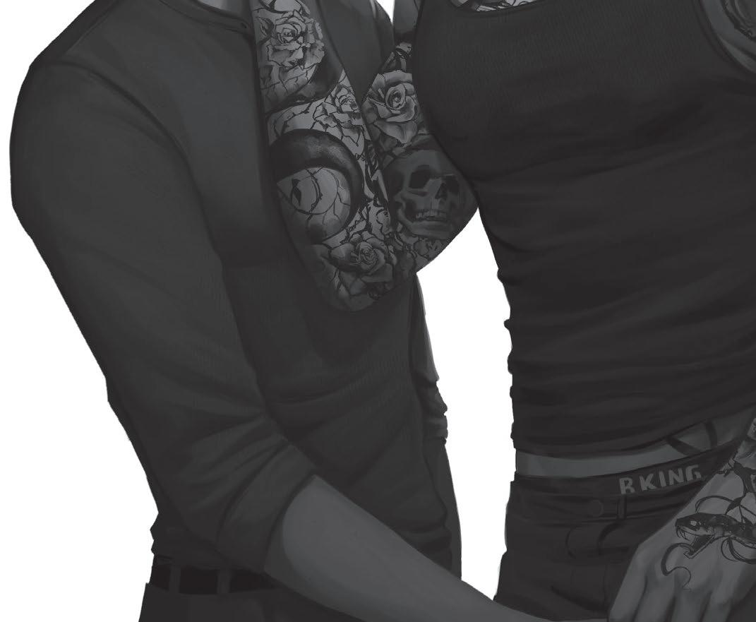 Extravagant tattoos spread over his chest, shoulders, arms, and all eight of his abs. He’s stupidly muscular in a very unnecessary way. His thick mane of hair is tied in a messy ponytail, which highlights his sharp jaw, harsh features, and unhinged eyes.