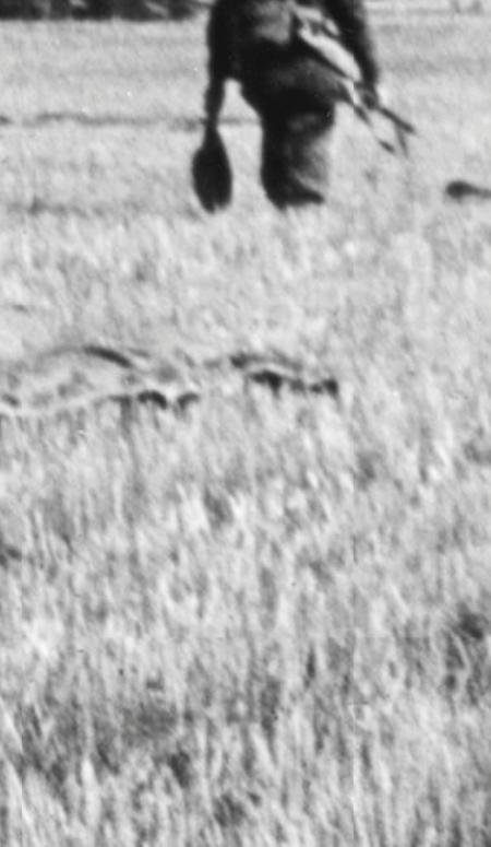 He tried for a stand-up landing, but the final oscillation and the weight of his equipment proved too much for him, and he rolled over in the dry, sandy earth. He had twisted and struck the release-box which held his harness together before