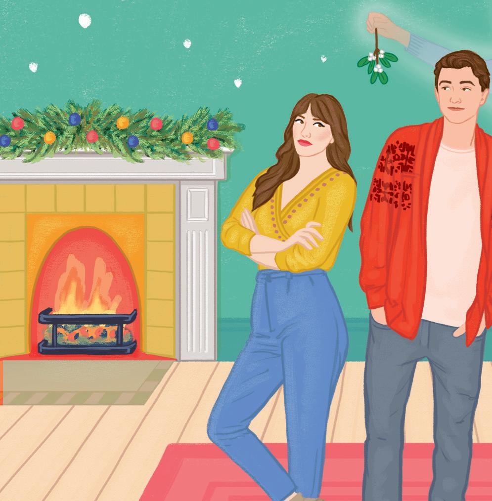 touched. Mia pushes away the sharp pang of disappointment that comes with the thought of James and continues hunting through her bag until she finds the pair of Christmas socks that she purchased on impulse last week. They are sprinkled with reindeer, all of which have tiny red pom-pom noses. They’ll be hidden by the legs of her jumpsuit, but work perfectly as the private pick-me-up she needs. She’ll change, freshen up and enjoy the rest of the party. She can just pretend Sam’s not there! There are plenty of other people to talk to, neighbourhood gossip to catch up on – ignoring him won’t be that hard. And once her stomach stops grumbling and she’s downed a cocktail or two, everything will feel better. Christmassy. Mia shuts her bedroom door behind her and moves towards the front staircase. Her hands are free – it was a conscious decision to leave her phone and her disappointments in her room. The landing is still devoid of Christmas cheer as the second tree hasn’t made its way up yet. But when Mia rounds the corner, she soaks in the familiar festive sight. Mum has the banister decked out like always, the intricately carved wooden staircase dripping with a thick garland that’s studded with warm white lights, taffeta bows and shining Christmas ornaments. The grandfather clock at the base of the stairs is also draped in ribbon, poinsettias and ornament baubles, and the hall tree has been outfitted with a tartan tote stuffed full of fresh evergreens. But the tree in the front room, situated directly in front of the large bay window and flanked by dramatic silk drapes, is the real showstopper. Mia winds her way