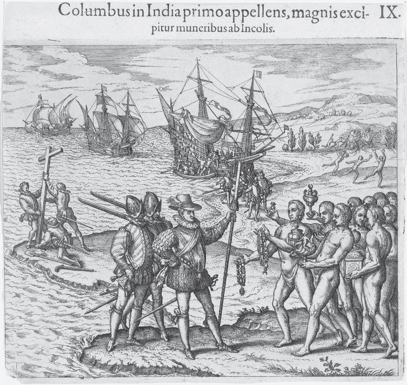 Etching of Christopher Columbus landing on the Caribbean island of Hispaniola in 1492 by Theodore de Bry, 1592.