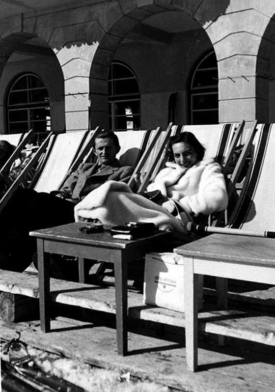 kontrasterar mot det mycket allvarligare, nĂ€stan forskande uttrycket hos mannen som ligger pĂ„ solstolen intill hennes. Det Ă€r svĂ„rt att avgöra om hans rynkade panna och kisande ögon beror pĂ„ solen eller pĂ„ missnöje med fotografen, som han stirrar pĂ„ nĂ€stan som om han ville honom nĂ„got. Ett cigarettpaket ligger pĂ„ ett litet bord intill, och bakom bordet stĂ„r en papperskasse, tjusig men inte överdrivet sĂ„. Man kan precis tyda att det stĂ„r âHotel Vittoriaâ pĂ„ den.