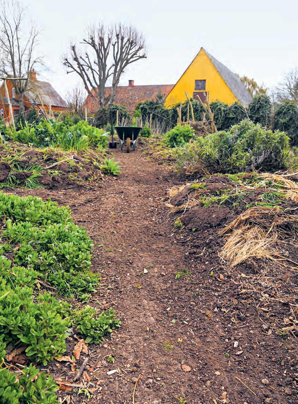 Det är alltid stökigt i köksträdgården om våren, ogräs ska rensas och det är mycket som ska hackas ner efter vintern. Solrosstjälkar, kålstockar och annat hamnar till slut på huggkubben. Den står praktiskt nog i köksträdgården så det är bara att hämta yxan och gå loss. Hacket samlar jag ihop och myllar ner i bäddarna – det blir ny fuktighetshållande och mullrik jord. Det är en ständigt pågående process, uppskattad av daggmaskar och mikroliv.