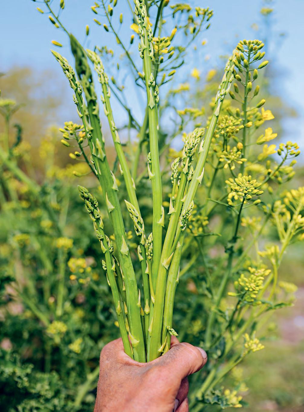 Alla kålsorter får blomknoppar som kan skördas innan blommorna slår ut. De små täta blomknopparna är verkligen en resurs när det inte finns så mycket annat att skörda. Det kan visserligen vara svårt att hinna med att äta dem alla, men blommor som fyller köksträdgården är också underbart. Knopparna är goda att steka råa, men de kan också förvällas och sedan stekas hastigt i olivolja. Underbart gott som tillbehör till vad som helst. En pasta med frästa blomknoppar blir en härlig vårlunch, gärna med snabbrostat ströbröd på.