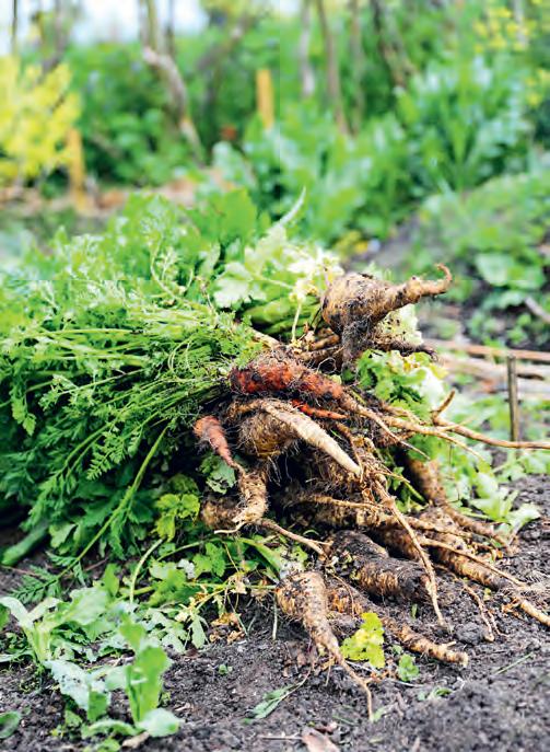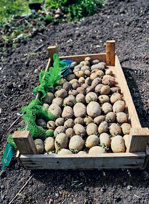 Överst till vänster: Uppstarten i köksträdgården är en fantastisk tid. Överblivna rötter grävs upp och kokas till buljong. Till höger: Sättpotatisen är redo att komma i jorden och groddarna är perfekt knubbiga. Jag hoppas på skörd till midsommar.