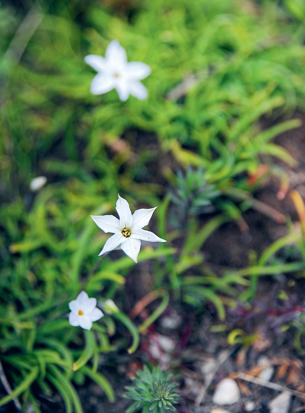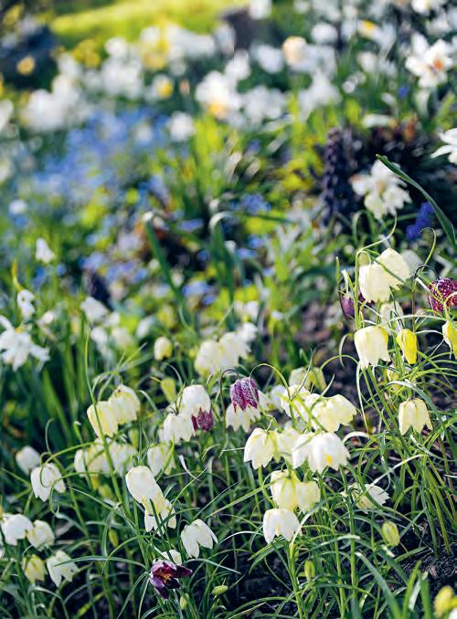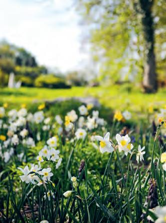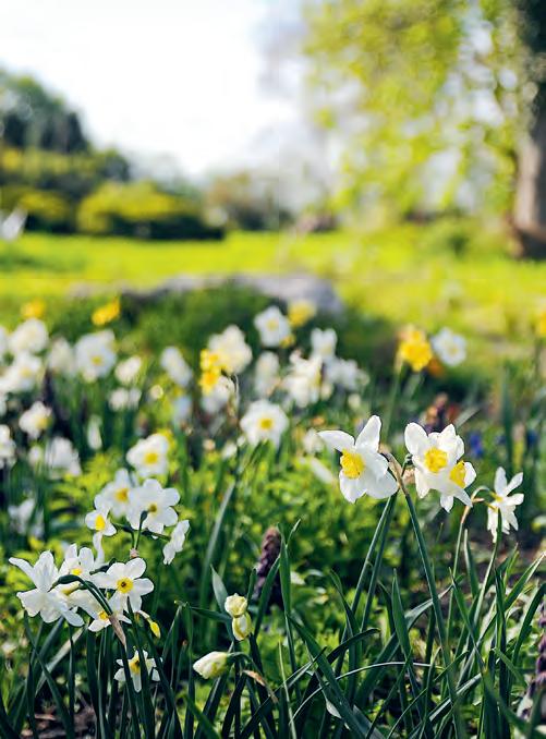 Nederst till vänster: Nätta blommor ger våren ett vackert skimmer som bara blir vackrare när blommorna förökar sig med åren. Till höger: Kungsängsliljor är vackra sällskap till narcisser. Även om det är flest vita ska det också vara några violetta med i blomningen.