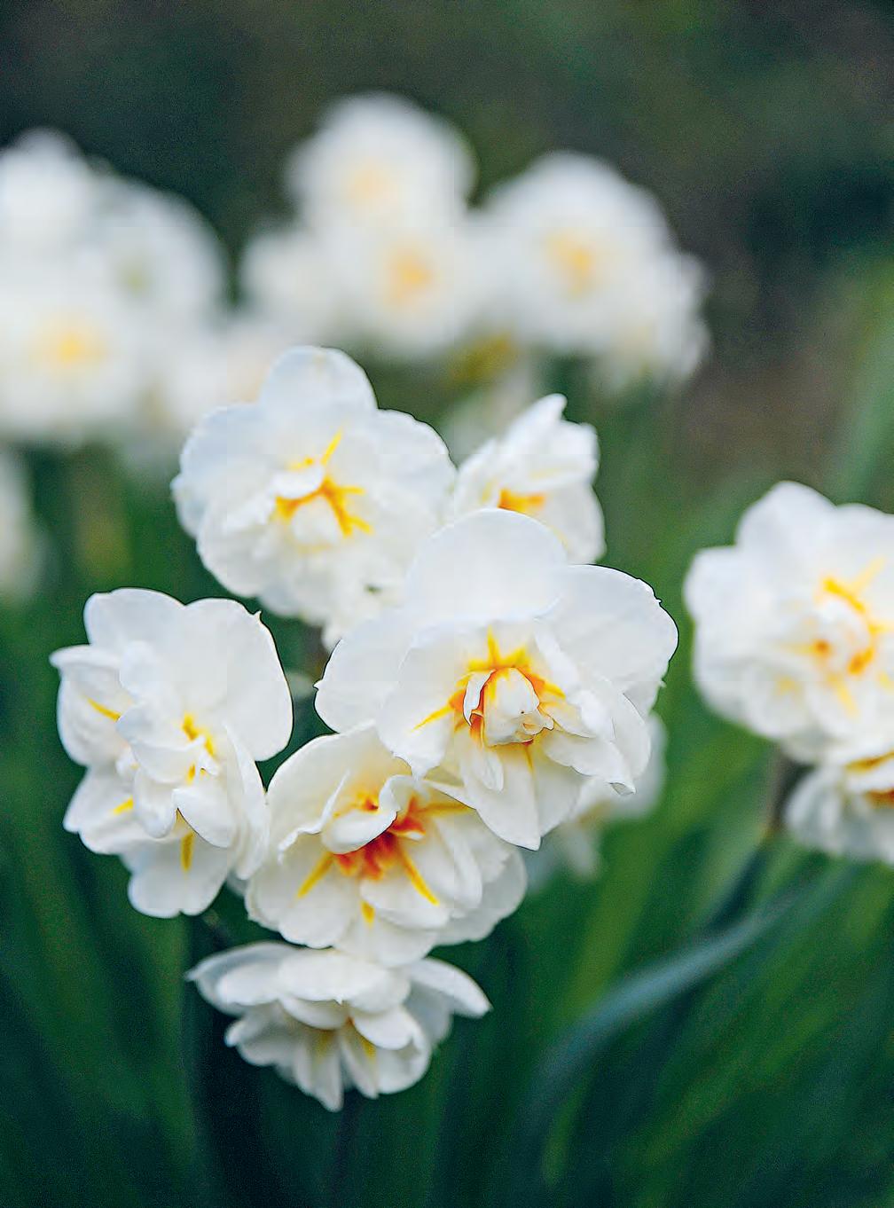 För övrig tidig blomning valde jag den förtjusande, korta och fyllda narcissen ’Tête Rosette’, men den vanliga enkla ’Tête à Tête’ duger också utmärkt. I rask takt spirar övriga narcisser, de flesta vita. Men gula måste ju vara med. Sorter som ’Petrel’, ’Thalia’, ’Papillon Blanc’, ’Lieke’, ’Sailboat’ och ’Paperwhite’. De har alla kalkblad från rent vitt till gräddvitt, och de små bikronorna varierar från vitt, gult till orange. Allt förenar sig mycket vackert och ger ett hänförande skimmer tillsammans med ljusa och mörka pärlhyacinter, samt stora vårstjärnor i rosa och blått, vilka också kommer att föröka sig till generös blomning i framtiden.
