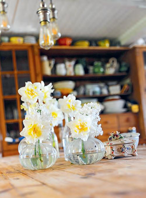 Överst till vänster: Fyllda ’Tahiti’ tillsammans med enkla, vanliga påskliljor ger liv i blomningen. Till höger: Fyllda narcisser kan vara svårt att förena med andra, men ’White Lion’ blir underbar i bukett tillsammans med vita syrener. Och doften ...