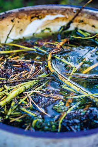 Det går också att använda andra ogräs till att göra näringsvatten, men näringsinnehållet blir lite olika beroende på vilka växter man använder. Om man drar upp ogräset med rötterna och lägger hela växten i blöt dör ogräsrötterna och kan sedan slängas på komposten. Det är fascinerande att halvruttna ogräs och ett år gammal hästskit kan förvandlas till söta frukter och vackra blommor.