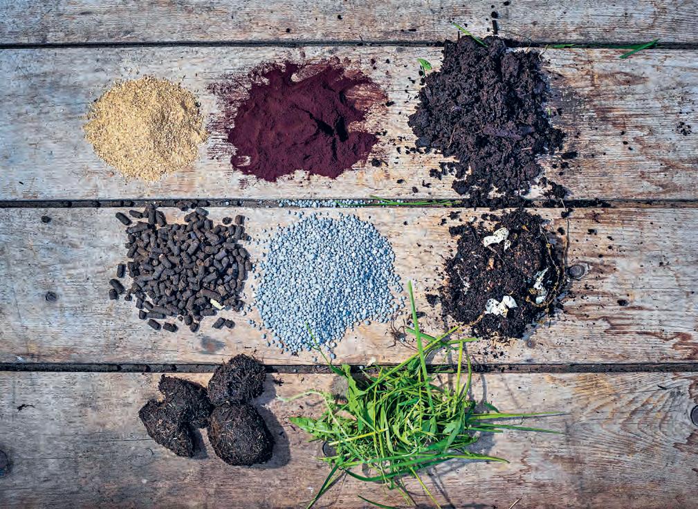 Naturgödselmedel tillför både näring och biologiskt material till jorden. De vanligaste är från vänster: benmjöl, blodmjöl, kogödsel från påse, pelleterad hönsgödsel, algomin, kökskompost, hästgödsel och gräsklipp.