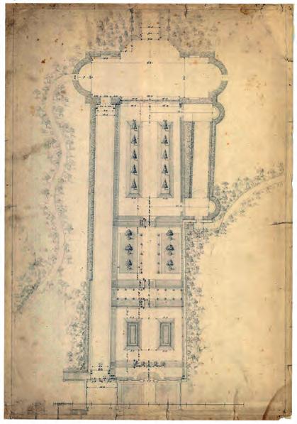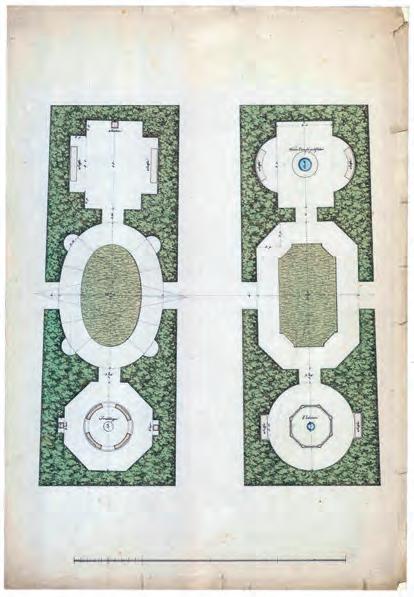 238 & 239. C.W. Carlberg: Ritningar till norra trädgårdens terrasser (238) respektive södra trädgårdens boskéer (239), omkring 1786. Den norra trädgården är, från norr, uppdelad i (a) Tvärskeppet med 7 meter höga klippta boskéer – häckar, (b) första terrassen med treillage till höger, (c) andra terrassen med formklippta träd, (c) tredje terrassen med 26 urnor, (d) fjärde terrassen med planteringsgårdar, (e) femte terrassen kallad Norra gården omgiven av balustrader prydda med sfinxer och grupper av putti, jämför Weinbergs akvarell från norr [252].