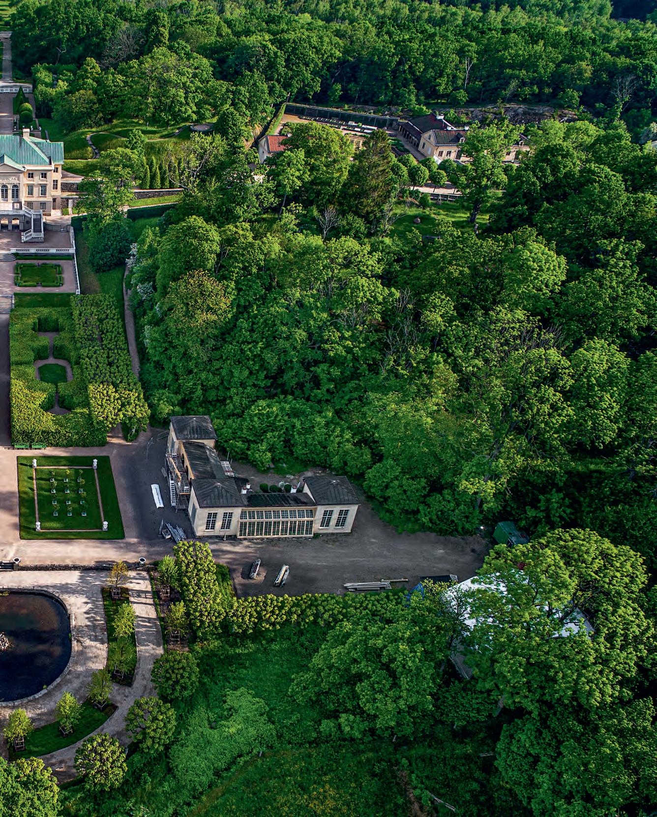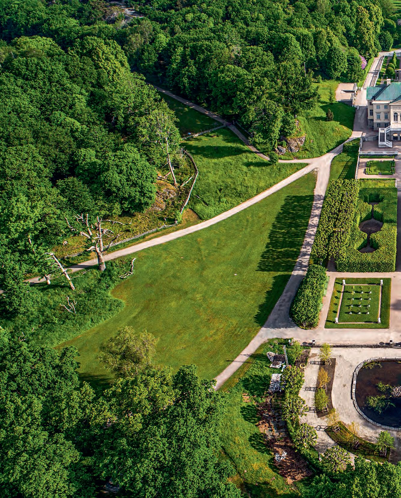 Gunnebos franska trädgård mot söder är nedifrån i bild uppdelad i (a) fontän, (b) boulingrins –bouleplaner, (c) boskéer – klippta häckar, (d) blomsterparterr och (e) fritrappa som leder från salong till trädgård. Till höger i höjd med boulingrins ligger orangeriet som rekonstruerades 2013–22 med författaren som restaureringsarkitekt. Foto: Sören Håkanlind, 2021.