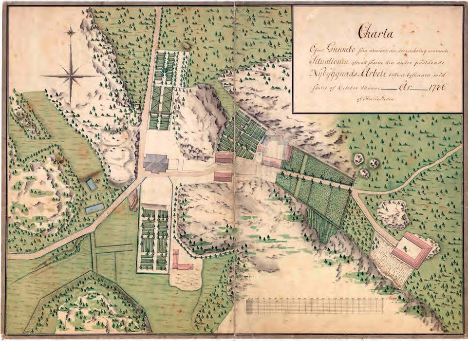236. Karta över Gunnebo från 1855 av O.W. Hällström som visar huvudbyggnaden i rött i kartans mitt med uppfartsrampen norr om och den franska trädgården söder om. Infarten skedde över bron i nordvästra hörnet och vägen i skogsbrynet ledde fram till karusellplatsen, som idag kallas Runde Sten.