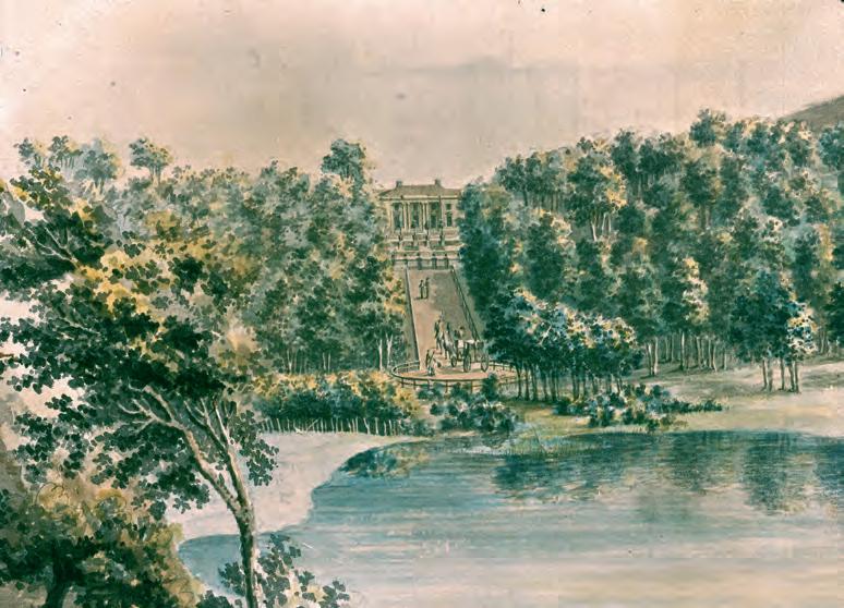 233. Justus Fredrik Weinberg: Gunnebo från norr med Ståloppet – kanalen mellan Rådasjön och Stensjön – i förgrunden, akvarell omkring 1800. Infartsvägen gick från en bro – utanför bild, längst till höger – och följde trädkanten fram till karusellplatsen »Runde Sten« nedanför slottets ramp, till vänster.