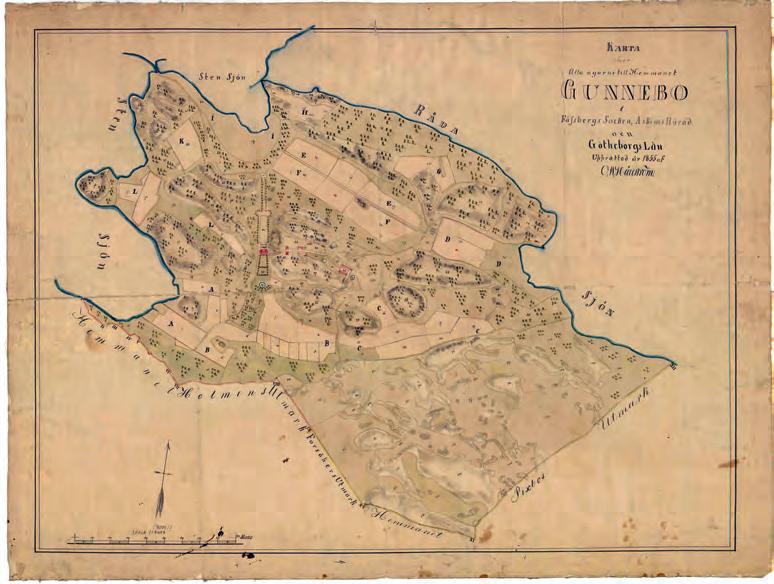 236. Karta över Gunnebo från 1855 av O.W. Hällström som visar huvudbyggnaden i rött i kartans mitt med uppfartsrampen norr om och den franska trädgården söder om. Infarten skedde över bron i nordvästra hörnet och vägen i skogsbrynet ledde fram till karusellplatsen, som idag kallas Runde Sten.