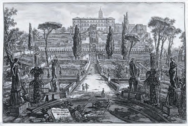 235. Giovanni Battista Piranesi: Tivoli, Villa d’Este, 1560–68, ritat av Carlbergs romerske favoritarkitekt Pirro Ligorio, är en av de romerska höjdanläggningar som Sergel associerade till när han besökte Gunnebo. Ur Vedute di Roma, Tomo 1, tavola 46, Rom 1761. Carlberg ägde ett 60-tal gravyrer av Piranesi.