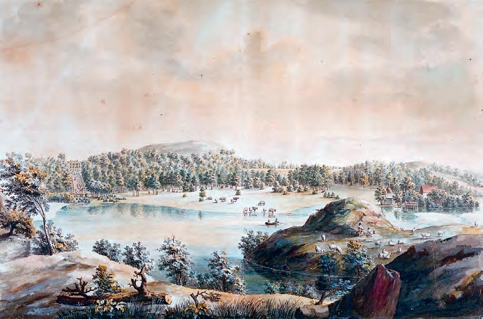233. Justus Fredrik Weinberg: Gunnebo från norr med Ståloppet – kanalen mellan Rådasjön och Stensjön – i förgrunden, akvarell omkring 1800. Infartsvägen gick från en bro – utanför bild, längst till höger – och följde trädkanten fram till karusellplatsen »Runde Sten« nedanför slottets ramp, till vänster.