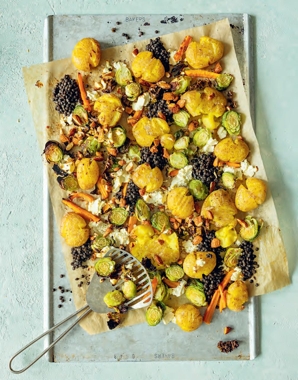 2. Sätt ugnen på 250 grader (225 grader varmluft). Lägg potatisarna på en bakplåtspappersklädd plåt och tryck till dem med en gaffel så att de spricker men inte går sönder. Skölj morötterna och skär dem i stavar. Ansa och skär brysselkålen i halvor. Lägg på plåten.