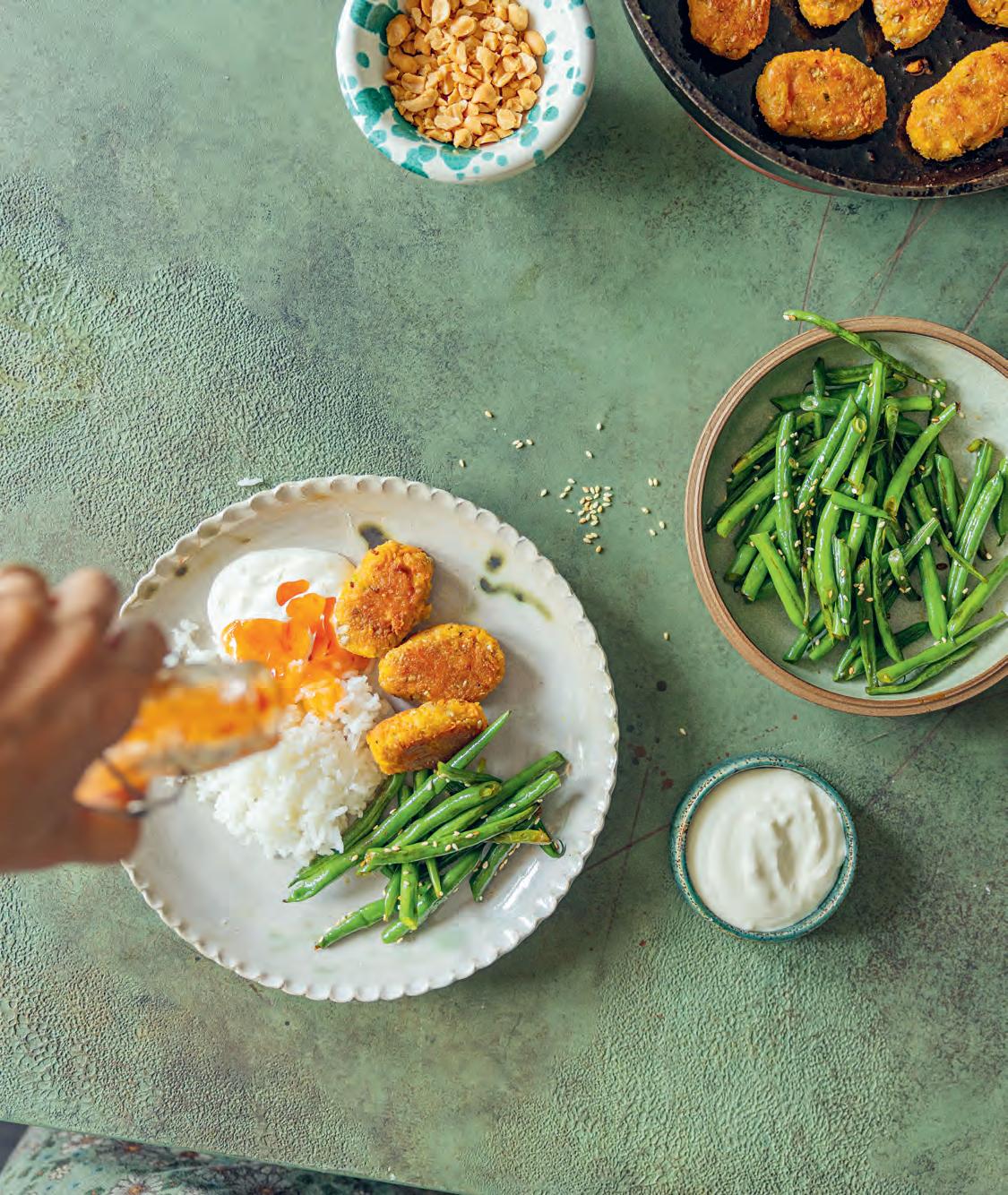 6. Servera nuggets och haricots verts med ris och gärna gräddfil, sweet chilisås och jordnötter.