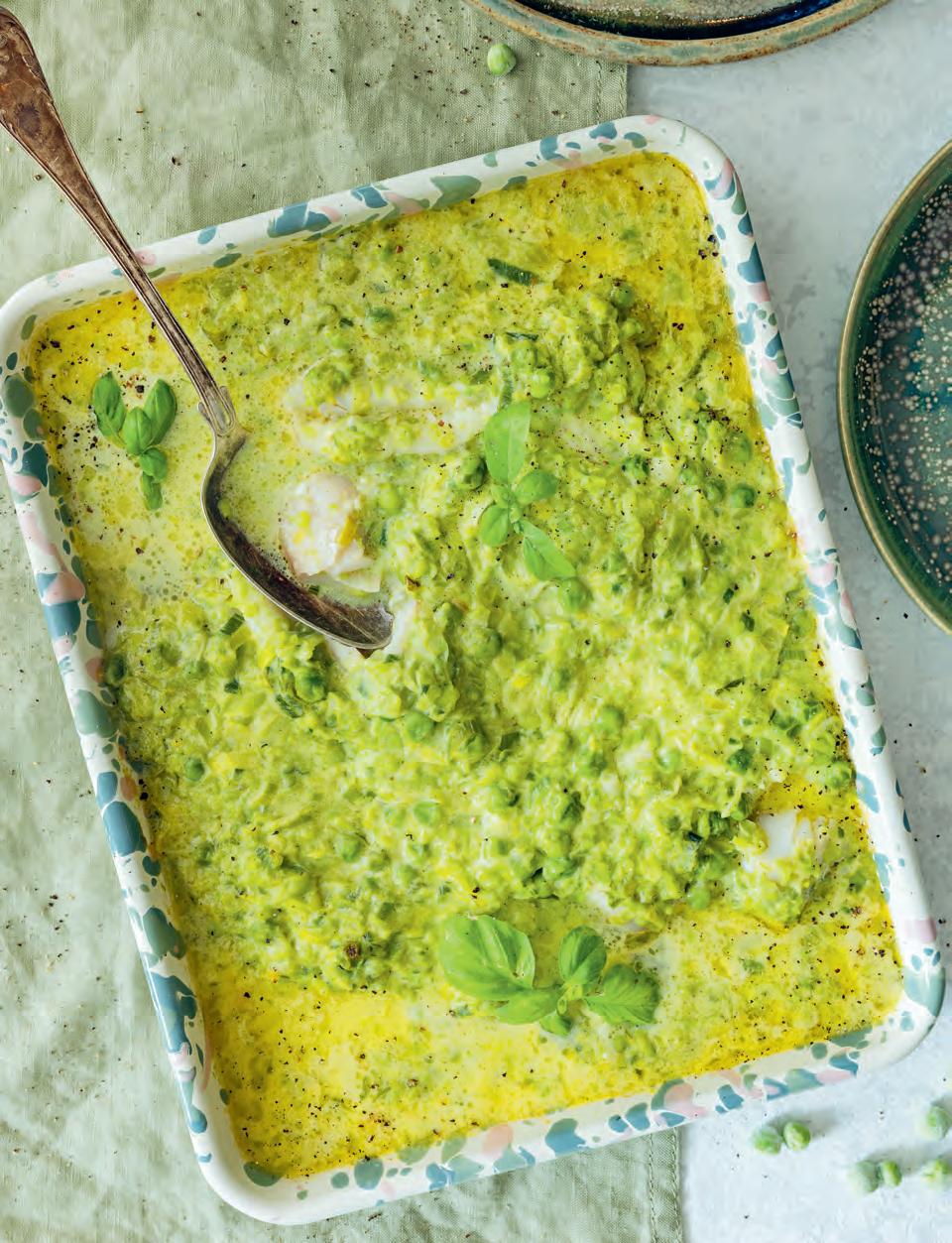 Ett oansenligt fiskblock från frysdisken blir här en piggt grön och gräddig gratäng. Om du vill kan du tina fisken och sjuda den några minuter i såsen på spisen i stället för att ugnsbaka den – det blir lika gott. Kokt potatis och några morotsstavar att knapra på passar bra till.