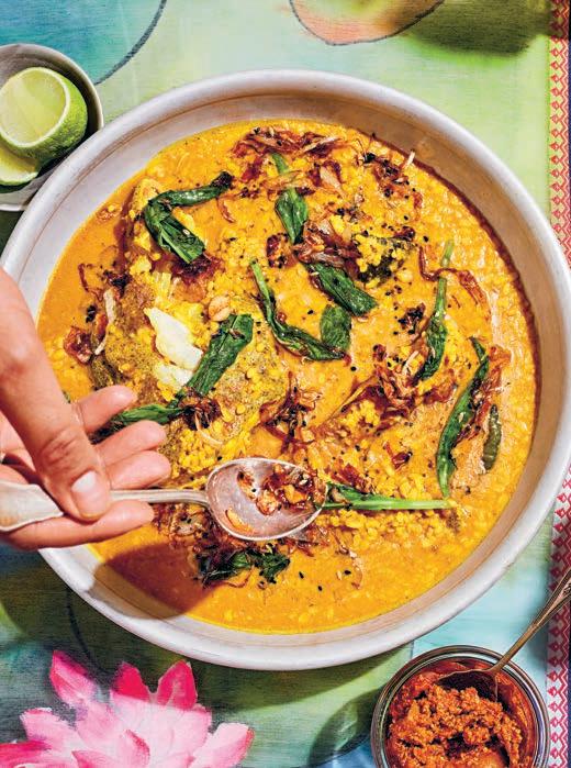 Dal med fiskhuvud För vanliga Svenssons låter kanske fiskhuvud läskigt, men precis som med annat protein sitter en stor del av smaken i ben och fett. Just därför är denna rätt så omtyckt av många bengaler. Vanligtvis använder man fiskhuvud med mer kött, som till exempel nationalfisken hilsa eller rohu, vilket blir jättegott. Jag gör den däremot ofta med piggvarshuvud och kragen (alltså biten precis under huvudet), vilket ger dalen en otrolig och djup smak. När ramslöken är i säsong här i Sverige är det lätt hänt att det trillar i några blad av den också.