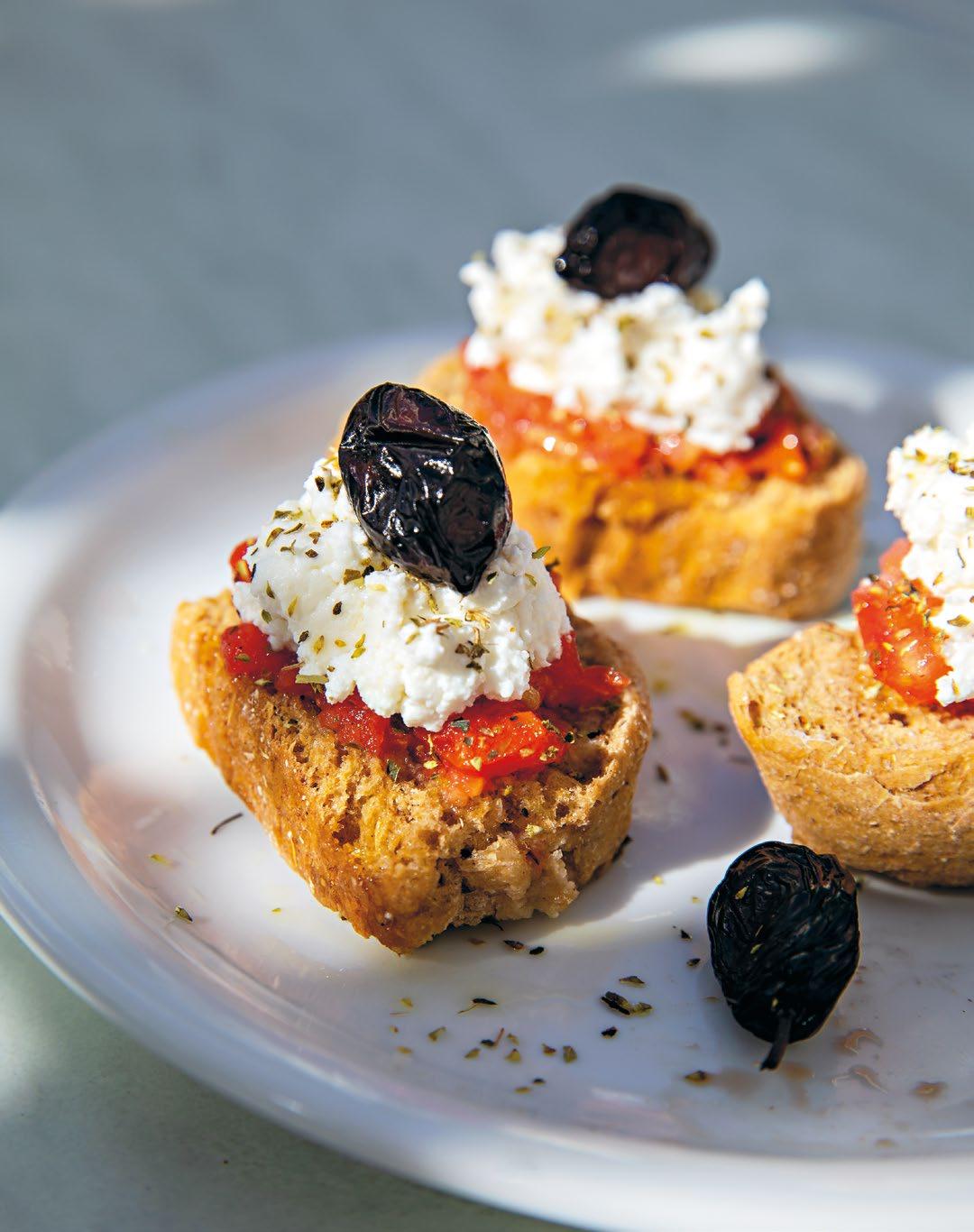 Dákos är ett klassiskt tilltugg från Kreta. Man använder speciella kornmjölsskorpor som toppas med riven tomat och olivolja, någon av ostarna myzithra, xenomyzithra eller feta samt soltorkade oliver och torkad oregano.