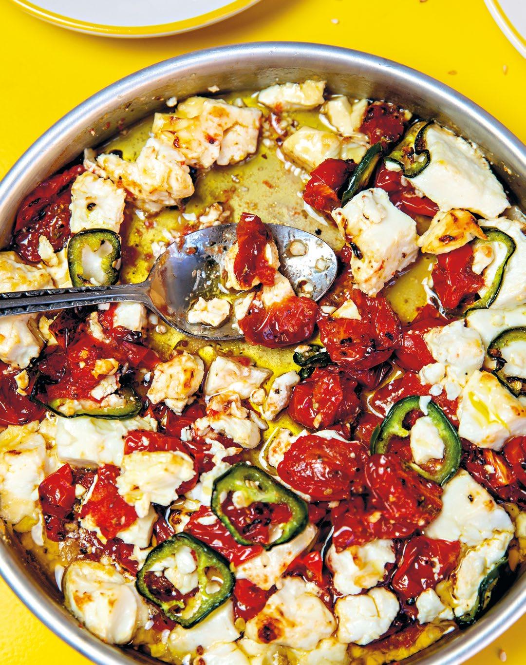 Bryt osten i stora bitar med händerna och varva dem med tomater och jalapeño i en ugnsfast form. Ringla över 1/2 dl olivolja och baka ytterligare 10–15 minuter tills osten fått färg och blivit mjuk.