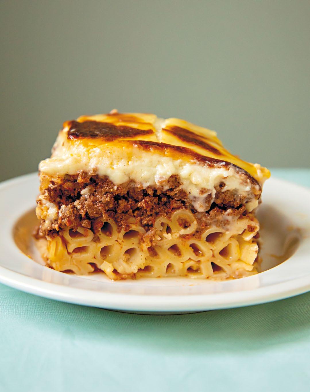 Kanske ännu mer av en grekisk lasagne än moussaka, eftersom denna faktiskt innehåller pasta. Men inga lasagneplattor, utan ziti. Den som har sett Sopranos vet att det handlar om en lång rörformad pasta, ungefär som bucatini fast med större hål. Carmela använder den för att laga Tonys favoriträtt: baked ziti, eller ziti al forno, där pastan blandas med tomatsås och polpette, alltså köttbullar, innan den toppas med ost och gratineras i ugn.