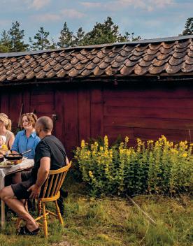 Tanken med sesambaguetten är dels att flörta med det klassiska hamburgerbrödet, dels att låta sesamsmaken i brödet möta sesamen i tahinin för att ringa in rätten. Vi serverade kebaben på bilden utanför Bjursnäs bygdegård en superregnig sommardag. Det slutade verkligen aldrig regna, men kebaben blev god.