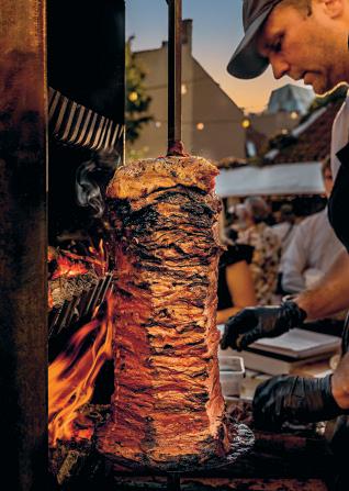 Som en service, en kebabservice. De allra första försöken gjorde jag på min innergård. Jag bjöd in vänner och vänners vänner och serverade kebabrullar till självkostnadspris. Första gången jag skulle tända grillen eldade jag först ett rejält märke i mitt arbetsbord och sen ett ännu grövre märke i asfalten jag stod på. En bit av asfalten smälte fast i ett plåtbleck. Men jag blev bättre och bättre! Och efter ett tag började restauranger höra av sig, kebabsuget var stort och det är alltid lika roligt att komma till nya restauranger och platser för att göra kebab ihop med köket.