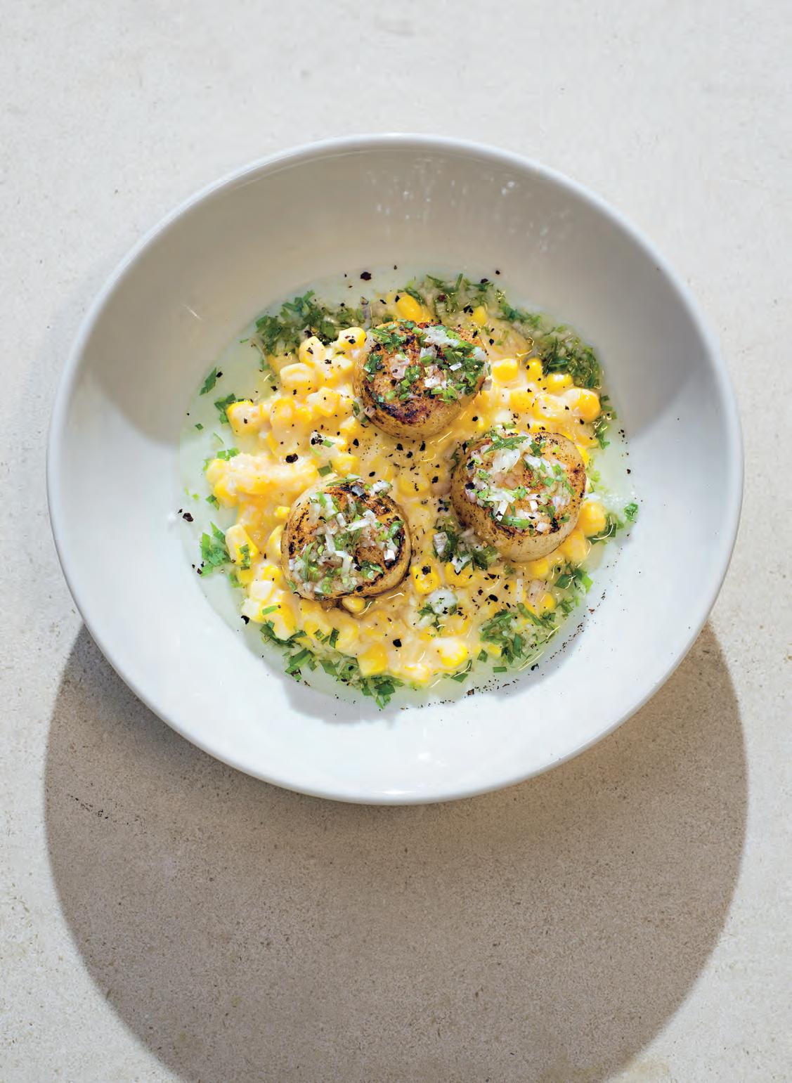 Vinägretten på dragon passar fint med den gräddkokta majsen, det är nästan en liten flört med bearnaisesås – och pilgrimsmusslorna blir pricken över i. Det är godast om du får tag i färsk majs när den är i säsong, men annars funkar det med både fryst och på burk.