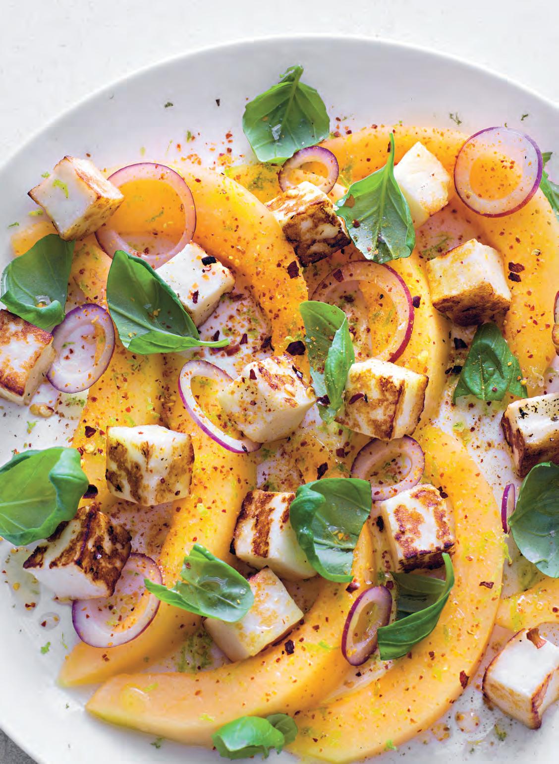 2. Stek halloumin runt om i matolja och servera direkt till melonen.